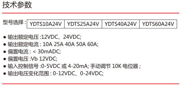 產(chǎn)品特性: ● 體積小,防水,防震動(dòng),無(wú)噪音無(wú)觸點(diǎn)引弧; ● 壽命長(zhǎng),抗干擾強(qiáng),可靠性高,調(diào)速范圍寬; ● 直流負(fù)載采用功率氧化物場(chǎng)效應(yīng)管輸出(MOSFET) ; ● 外接0-5V 或4-20mA 信號(hào)即可實(shí)現(xiàn)輸出電壓調(diào)節(jié),使用簡(jiǎn)單化; ● 螺絲固定安裝,標(biāo)準(zhǔn)模數(shù)化尺寸,配有安全保護(hù)罩; ● 100% 負(fù)載老化試驗(yàn),通過(guò)歐共體CE 認(rèn)證,國(guó)際I S09000 認(rèn)證;。